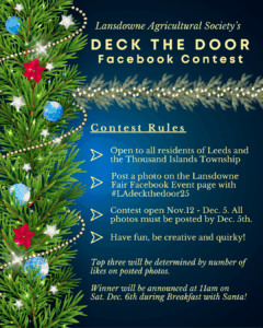 Deck the Door Posted on November 8, 2025Deck the Door Facebook Contest Open to all residents in the Township of Leeds and The Thousand Islands See instructions on the poster